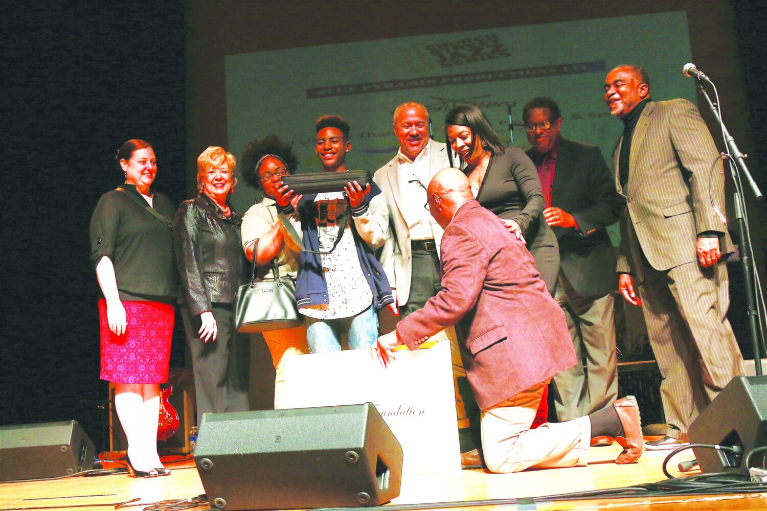 Persons attending the Richard Elliott Show at the Attucks Theater last Saturday night got an extra treat when Jay and Priscilla Lang of the HJLang Foundation presented a musical instrument during intermission to Zymari Jackson. The foundation is committed to gifting talented middle and high school students in each of the seven Hampton Roads cities during the annual Church Street Jazz Series which Lang founded and produces. Zymari, a Northside Middle School student was accompanied by his mother Savannah Jackson, and was referred by Danielle Roby, the senior coordinator of music at Norfolk Public Schools. His music teacher is Dionne Sexton. The presentation was made in the name of two of the sponsors of the Jazz Series, Brenda H. Andrews and the New Journal and Guide, and Dr. Keith Newby, founder Fort Plaza Medical Center.