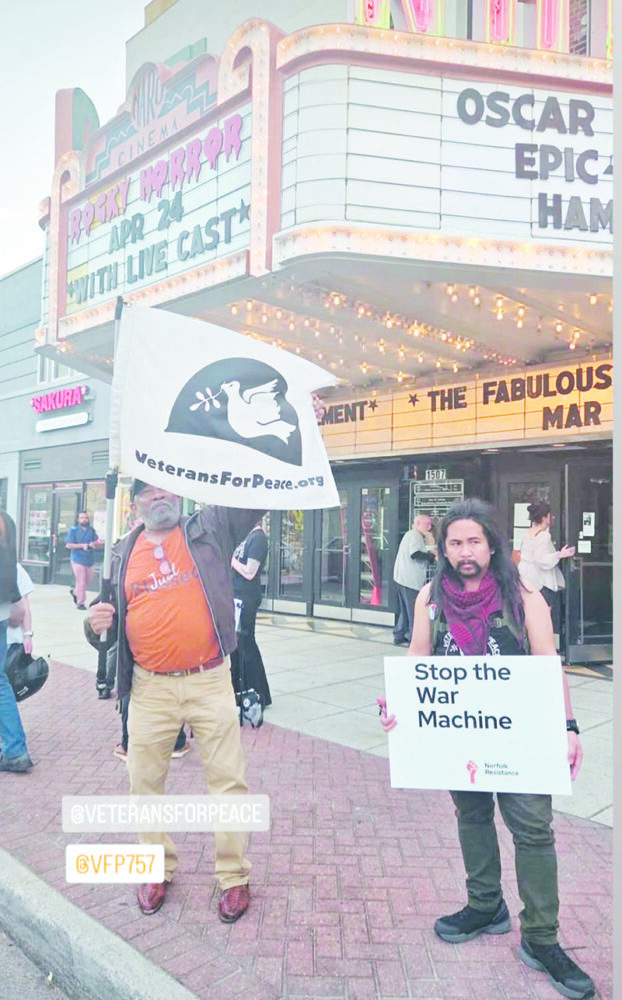 Ernest Lowery, USN Vet, and member of the local 757 chapter of Veterans for Peace, (in accompanying photo) flies the VFP flag to welcome folks in front of The Naro Cinema, on Colley Ave, Norfolk, on Wed. March 11. The Naro presented a special screening of the new feature film,